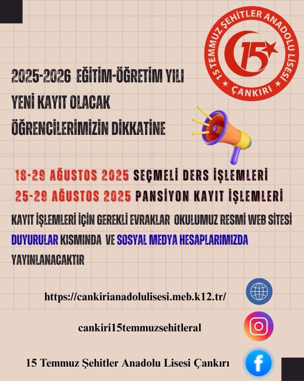 Öğrenci kaydı ve seçmeli ders işlemlerini tamamlamak üzere 18-29 Ağustos 2025 tarihleri arasında velilerimizi okulumuza bekliyoruz.